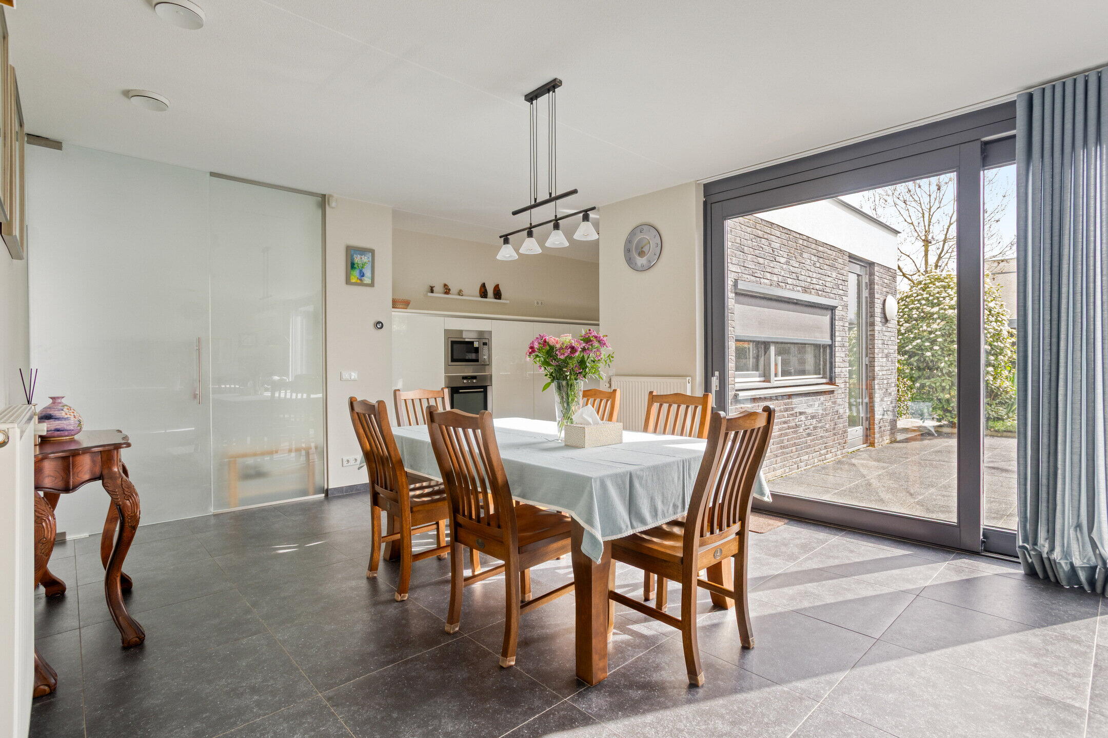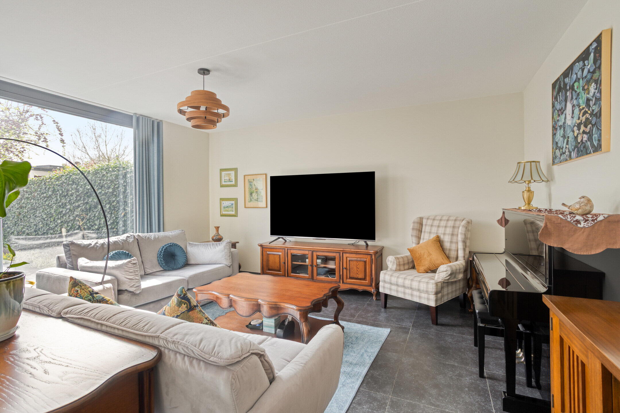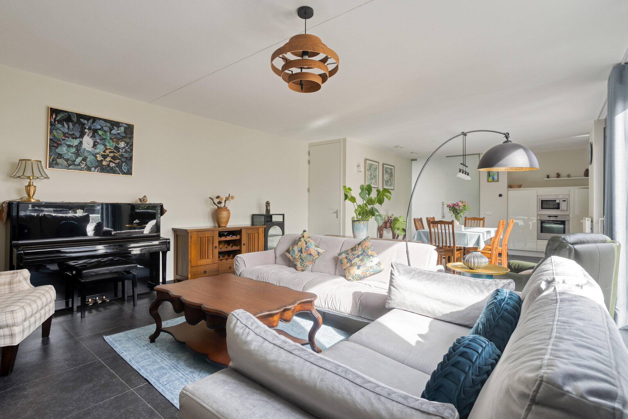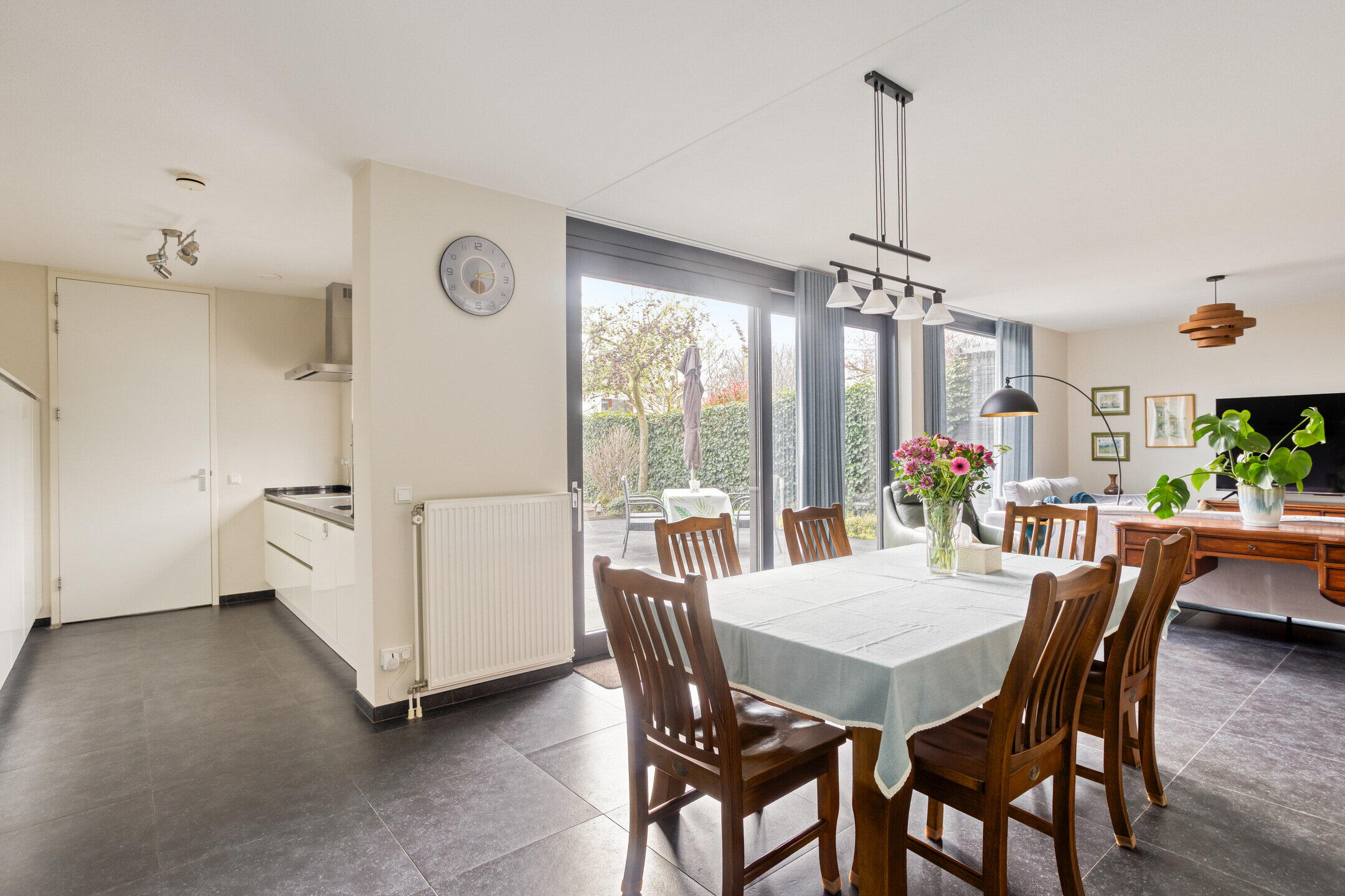 De hal, woonkamer en keuken zijn afgewerkt met een stijlvolle donkergrijze plavuizenvloer.