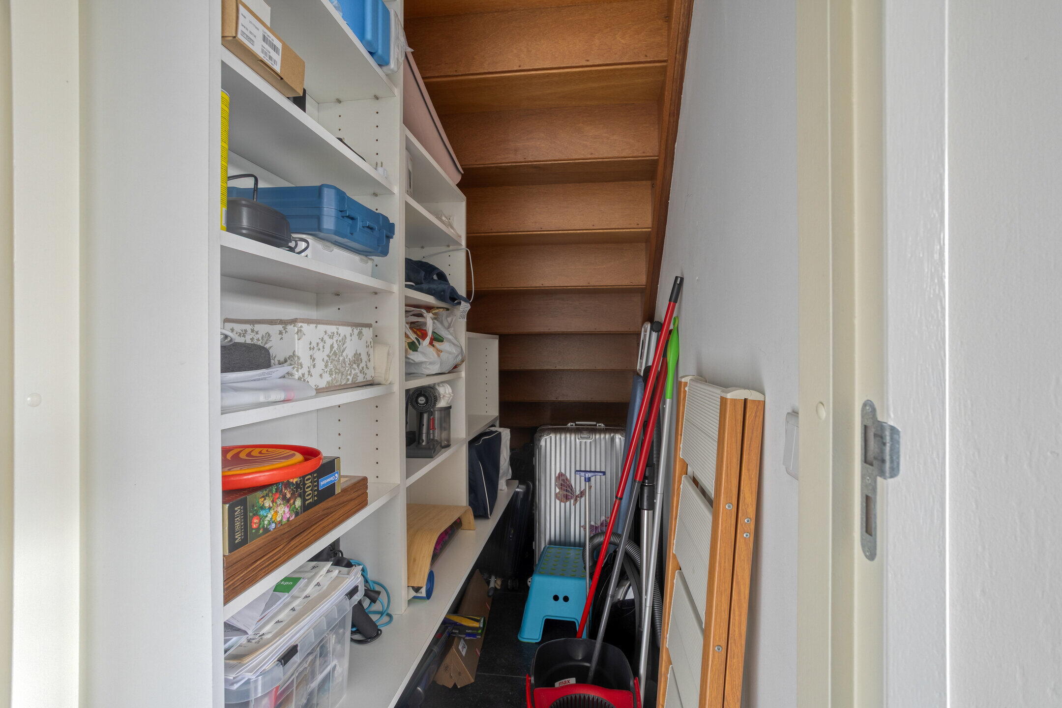 Deze lichte leefruimte biedt een prachtig zicht op de tuin en is voorzien van grote raampartijen en een brede schuifpui voor optimale lichtinval en directe toegang naar buiten. In de woonkamer is een trapkast (ca. 2 m²) te vinden.