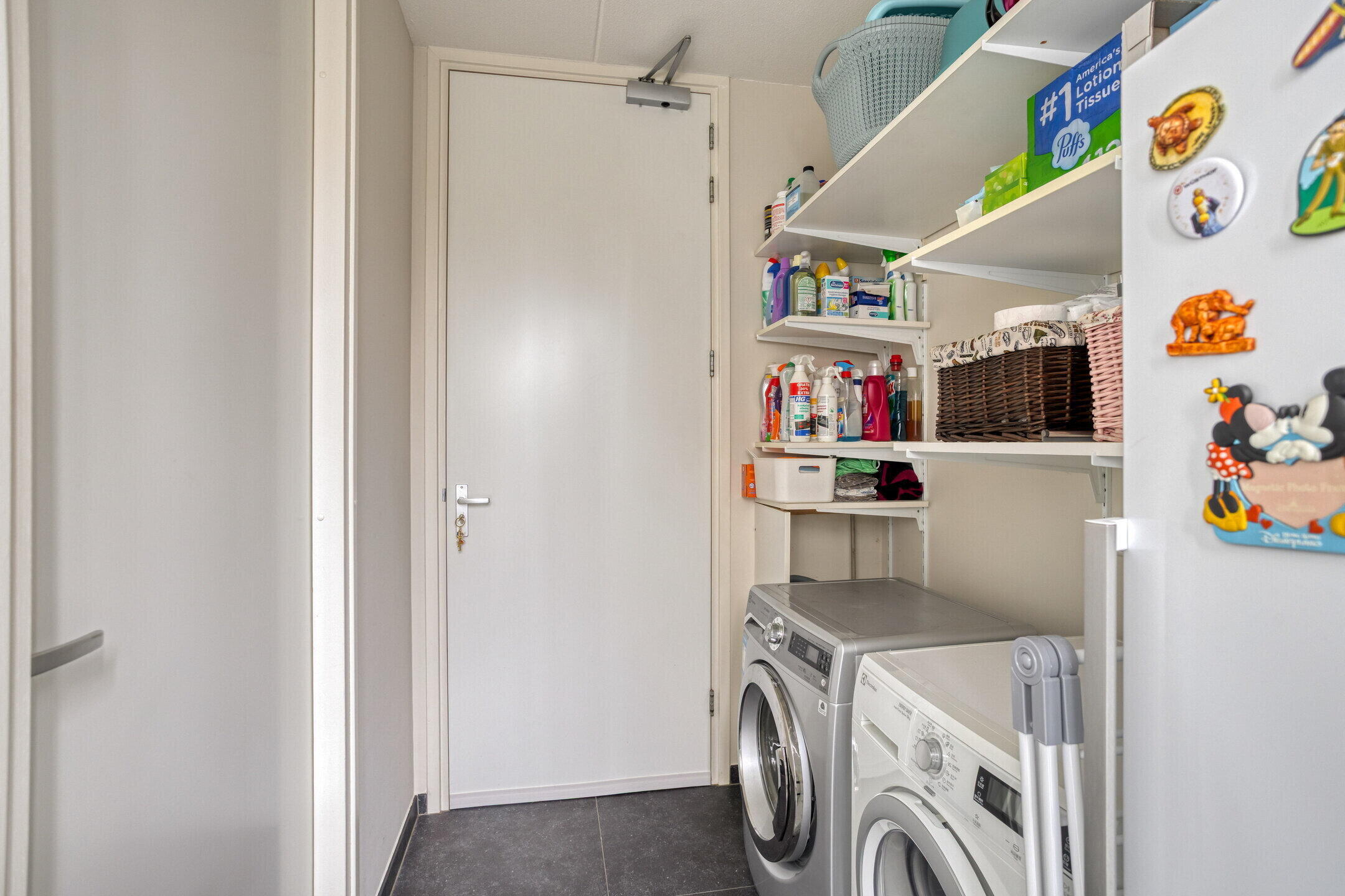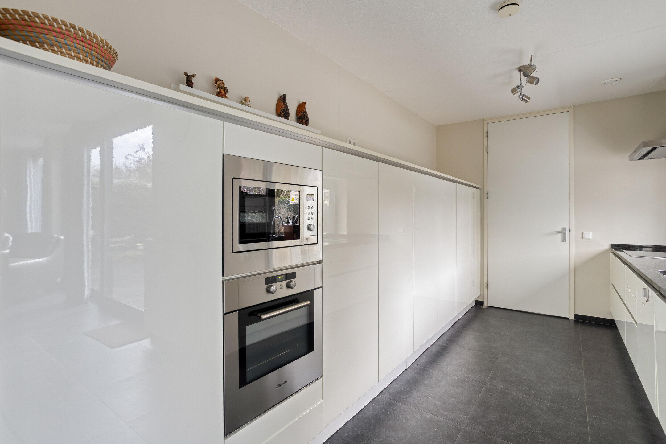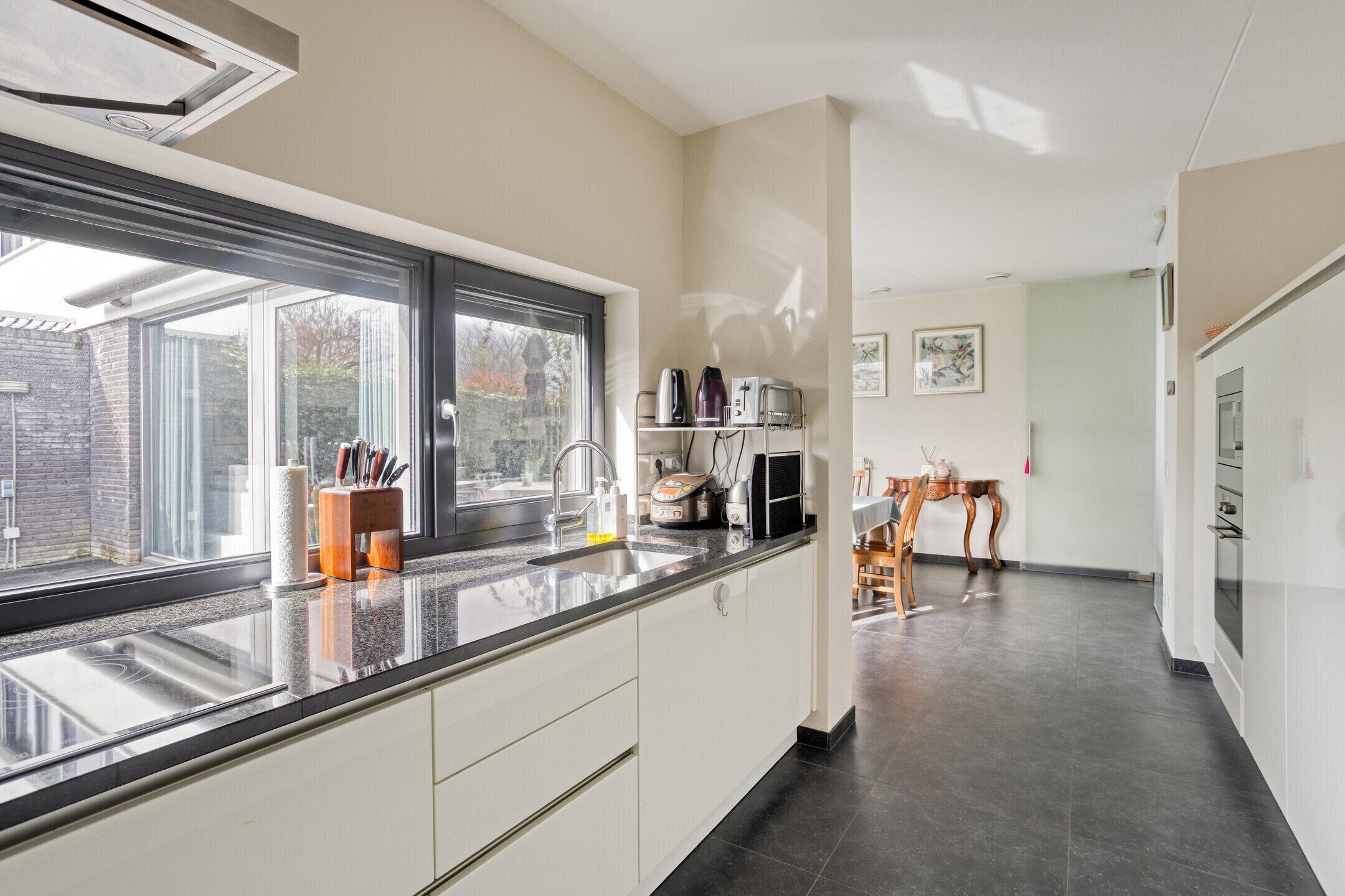De modern keuken (ca. 10 m2) in hoogglans off-white uitvoering is afgewerkt met een donkergrijs granieten werkblad en voorzien van diverse inbouwapparatuur, waaronder een vaatwasser, inductiekookplaat met afzuigkap, combi-oven/magnetron, oven en een ruime koelkast. Daarnaast beschikt de keuken over veel praktische bergruimte. Aansluitend bevindt zich de bijkeuken (ca. 5 m²) met aansluitingen voor witgoed, extra opslagruimte en toegang tot zowel de woningbrede tuin (ca. 16 meter diep) als de garage (ca. 20 m2 ruim).