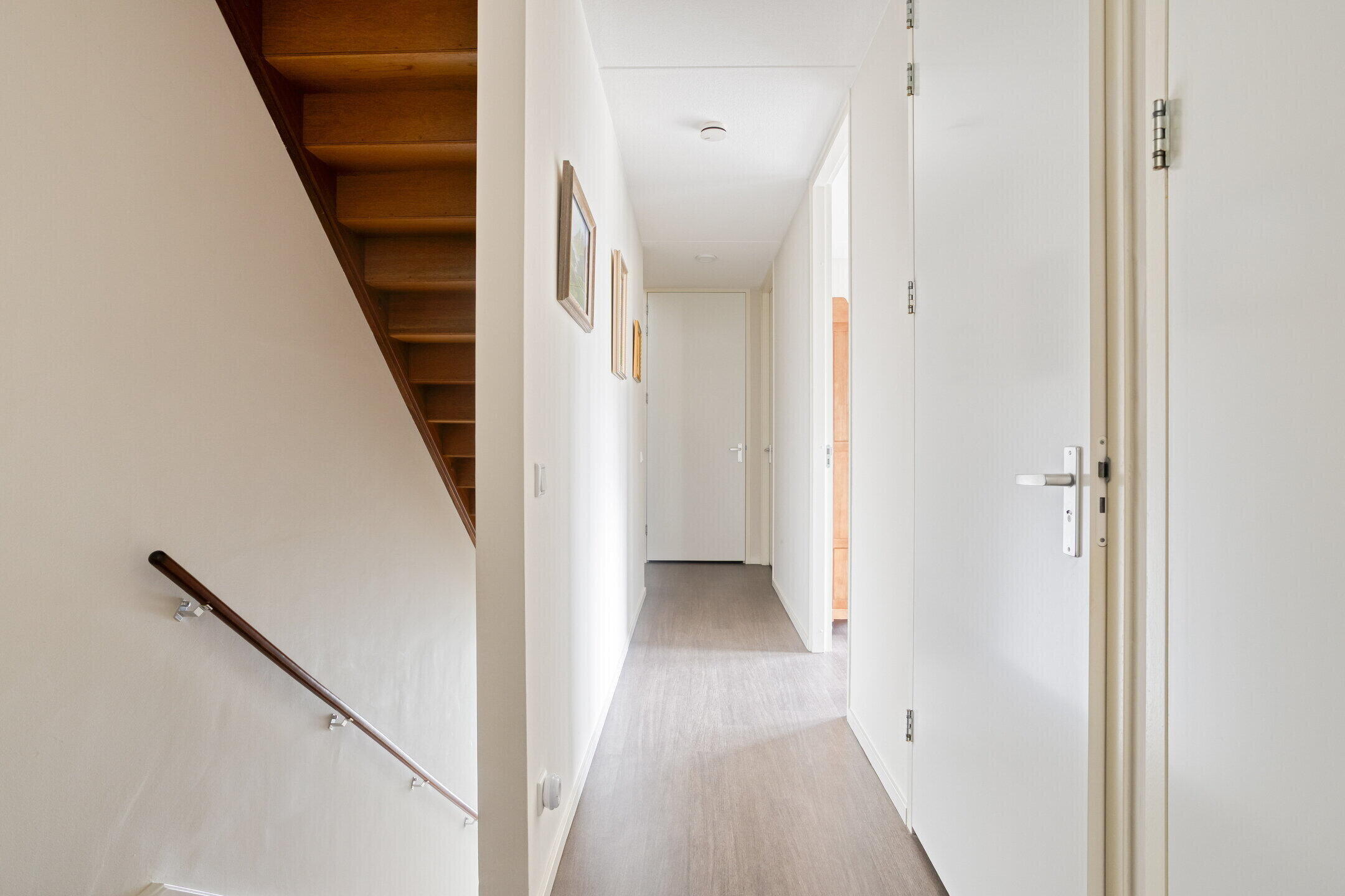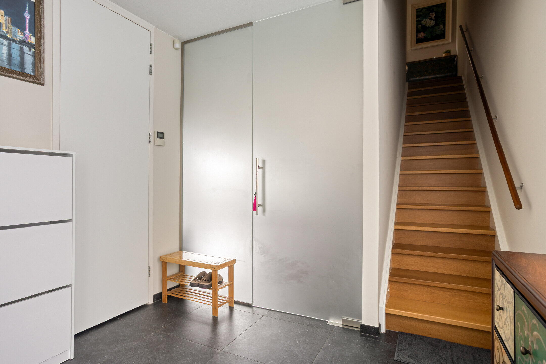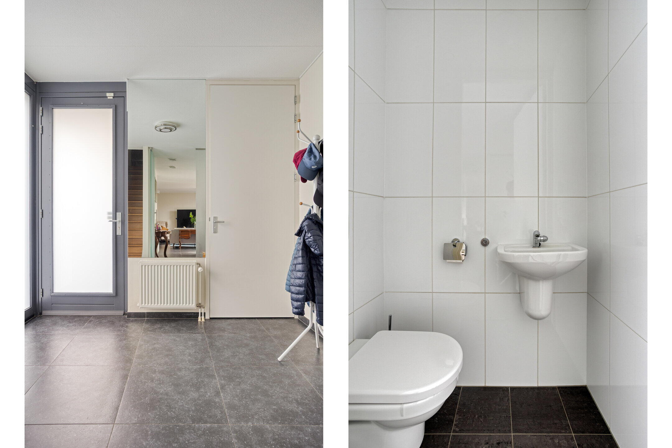 Ruime heldere entree (ca. 9 m²) met meterkast, moderne toiletruimte en trapopgang naar de eerste verdieping.