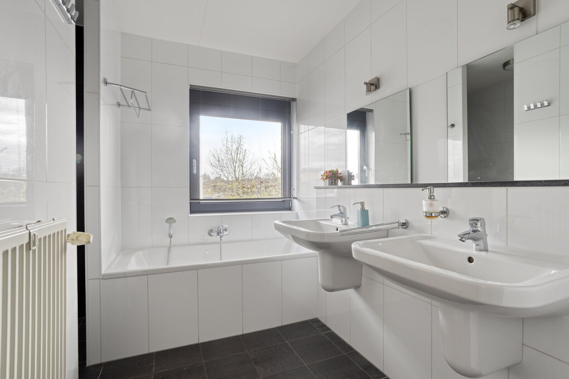 De badkamer (ca. 7 m²) is modern en compleet uitgevoerd met een ligbad, inloopdouche en dubbele wastafel.