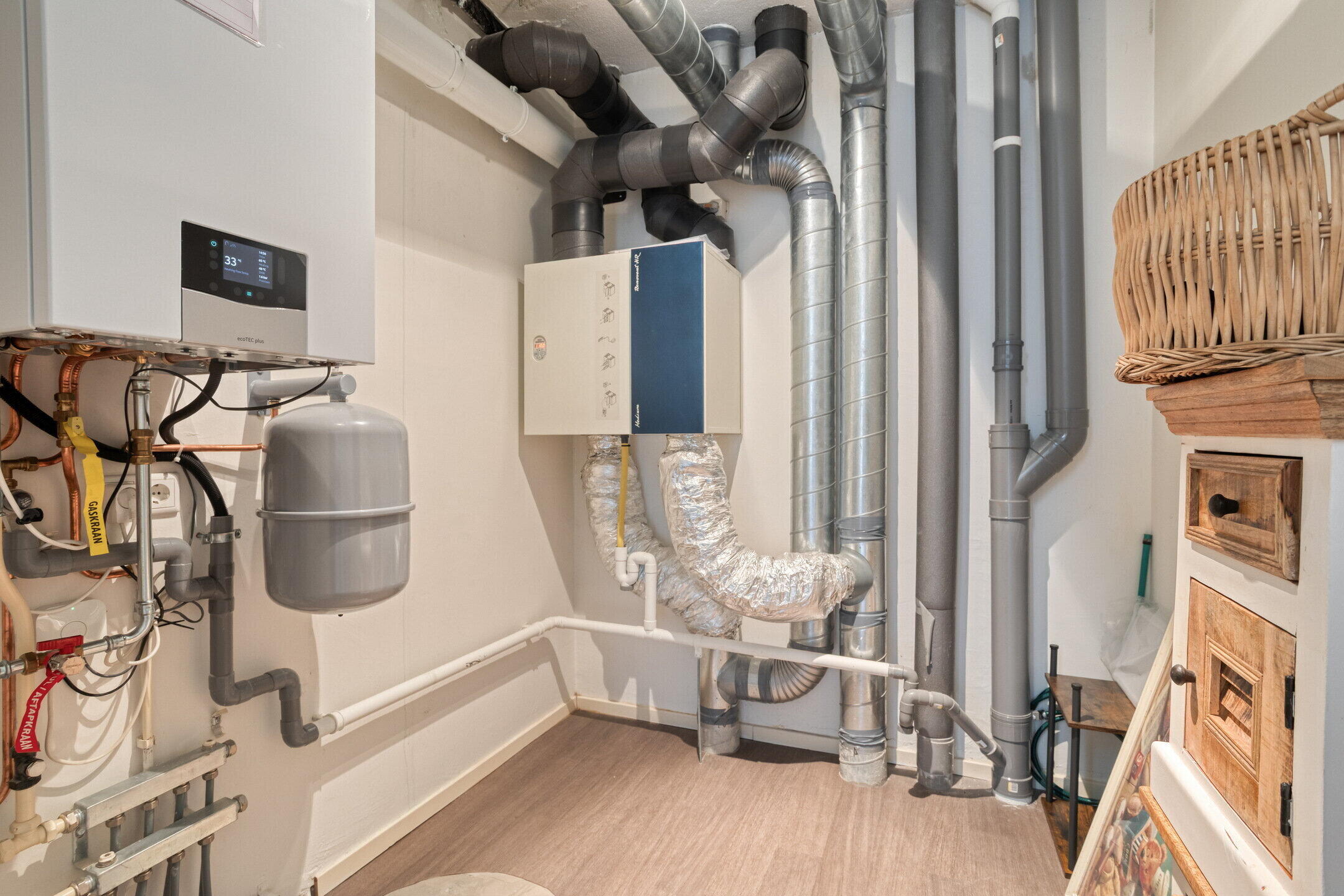 In de technische ruimte (ca. 5 m²) zijn de HR-combiketel (2023, eigendom) en WTW-installatie. De zonneboiler is recent verwijderd, de aansluitingen zijn nog aanwezig evenals de bijbehorende warmtepanelen op het hoofddak.
