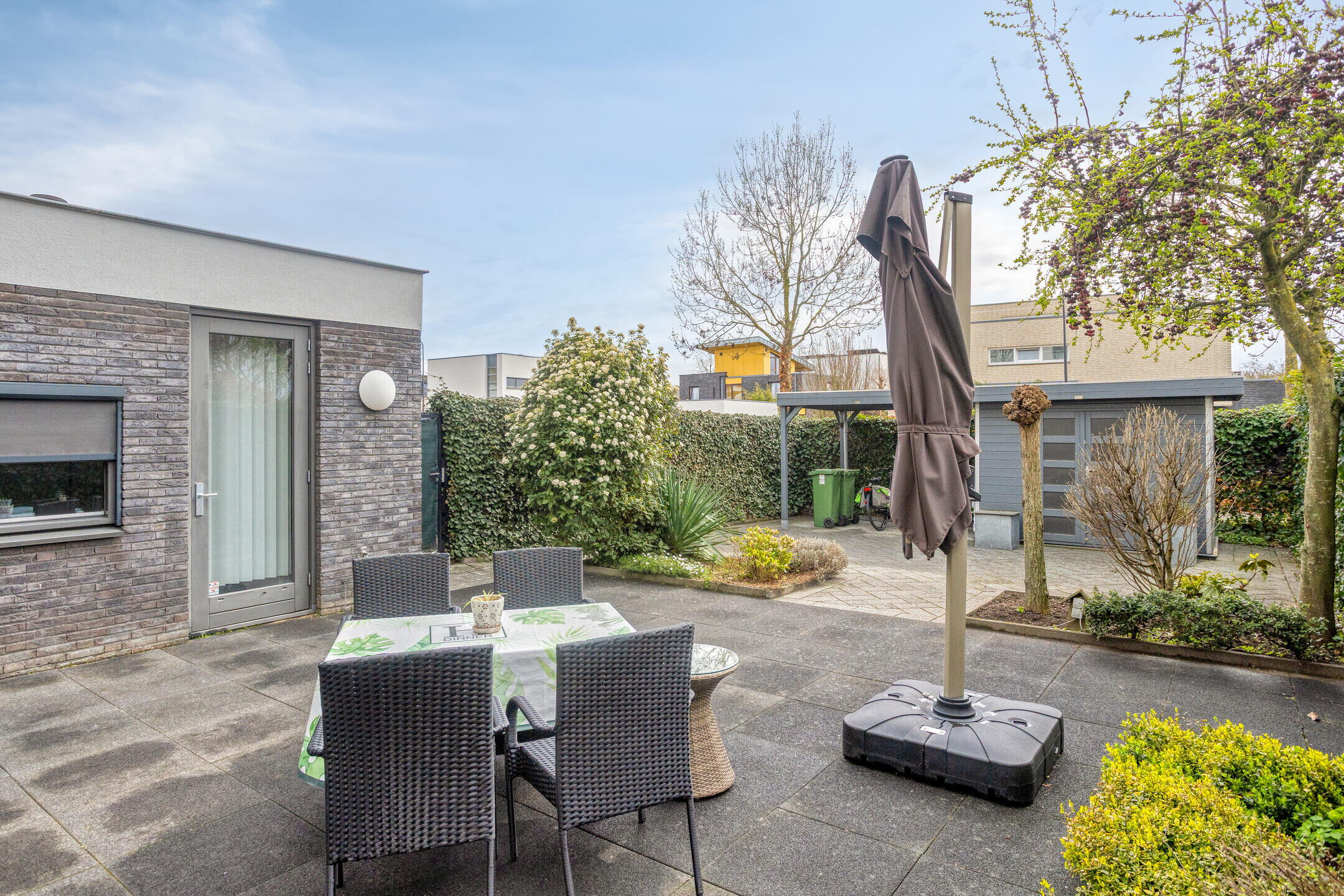 - Fijne ruime tuin op het zuiden met terrasscherm en tuinhuis en zij-ingang;