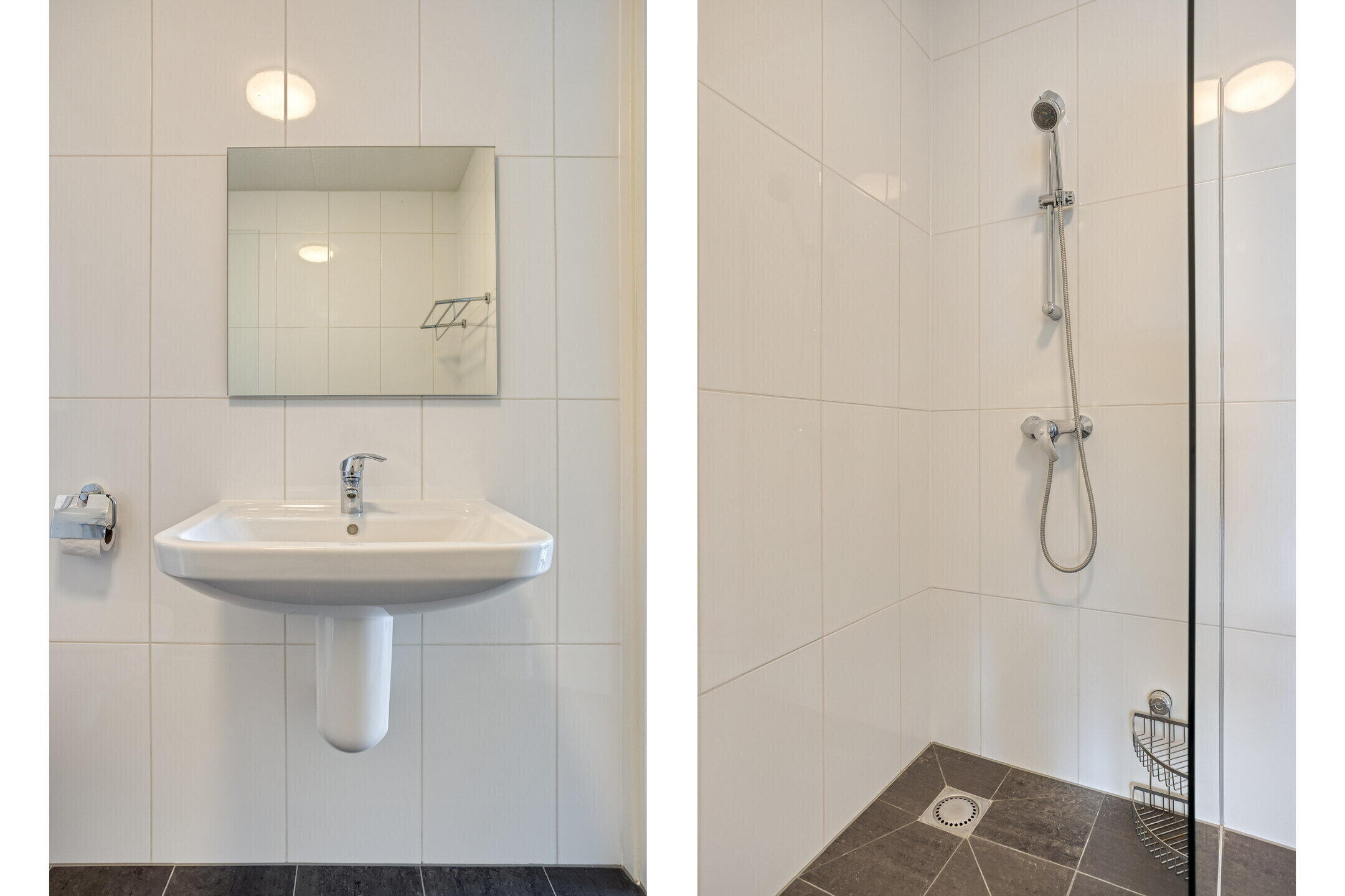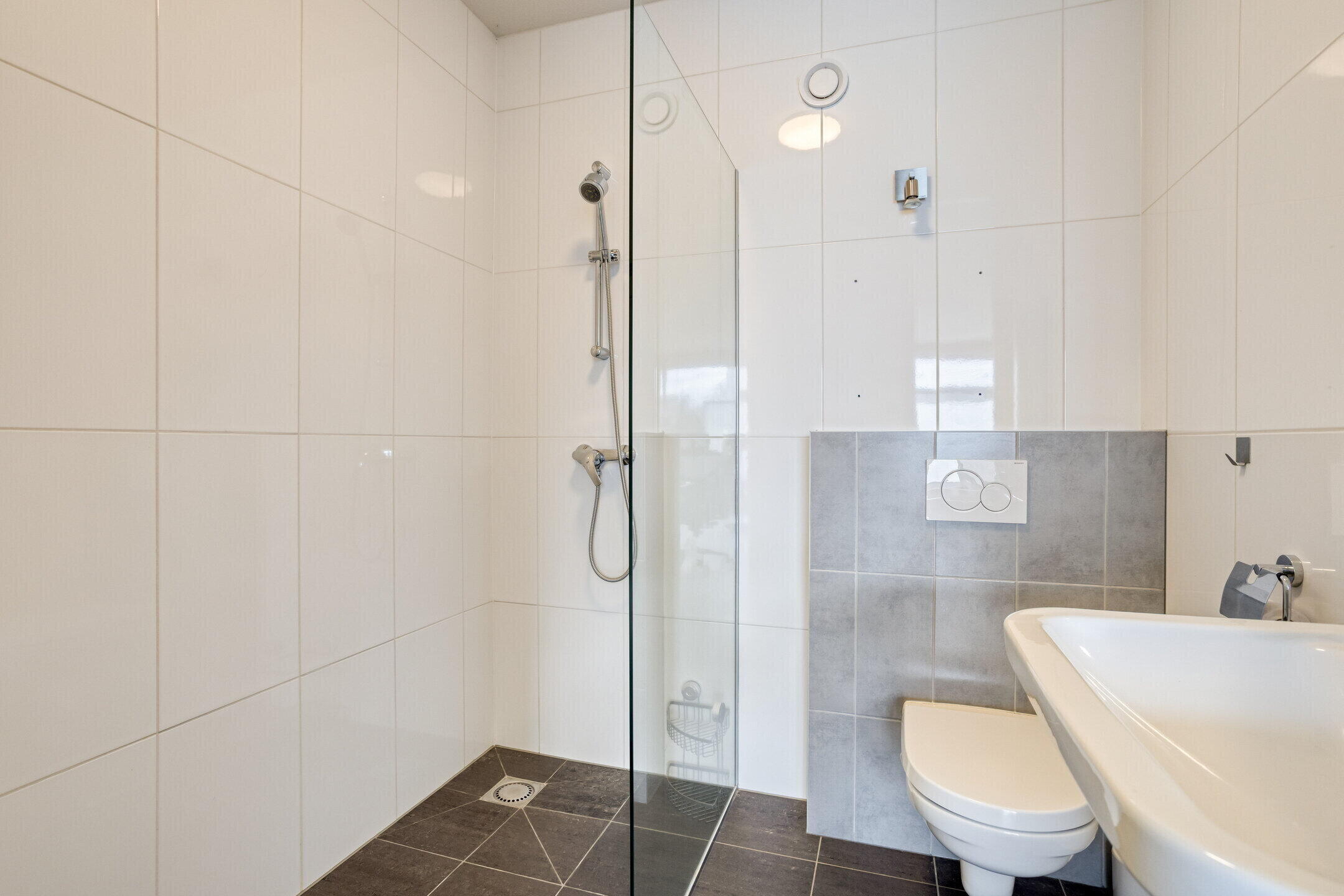 Tweede badkamer: modern, ca. 4 m² groot, voorzien van toilet, wastafel en inloopdouche.