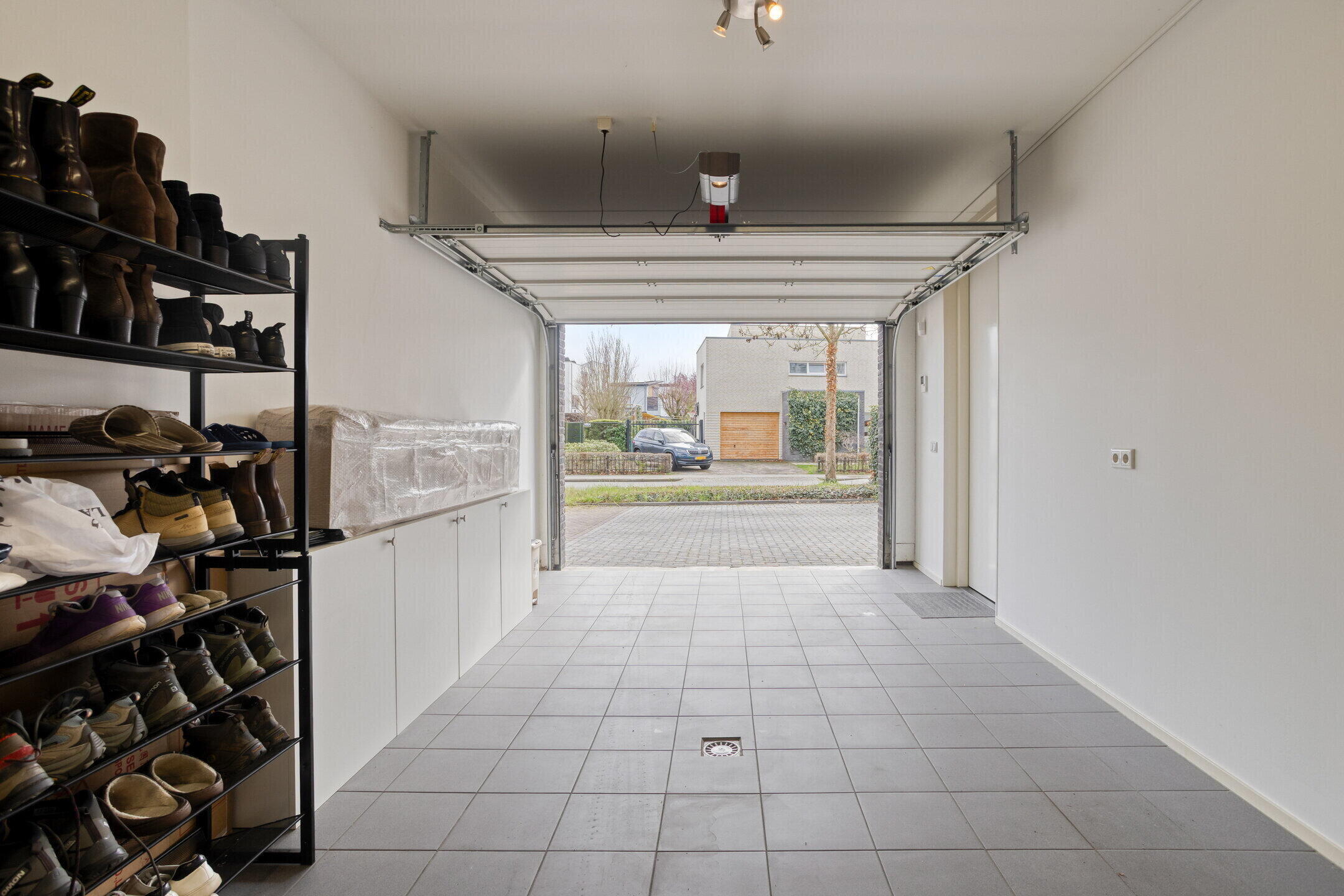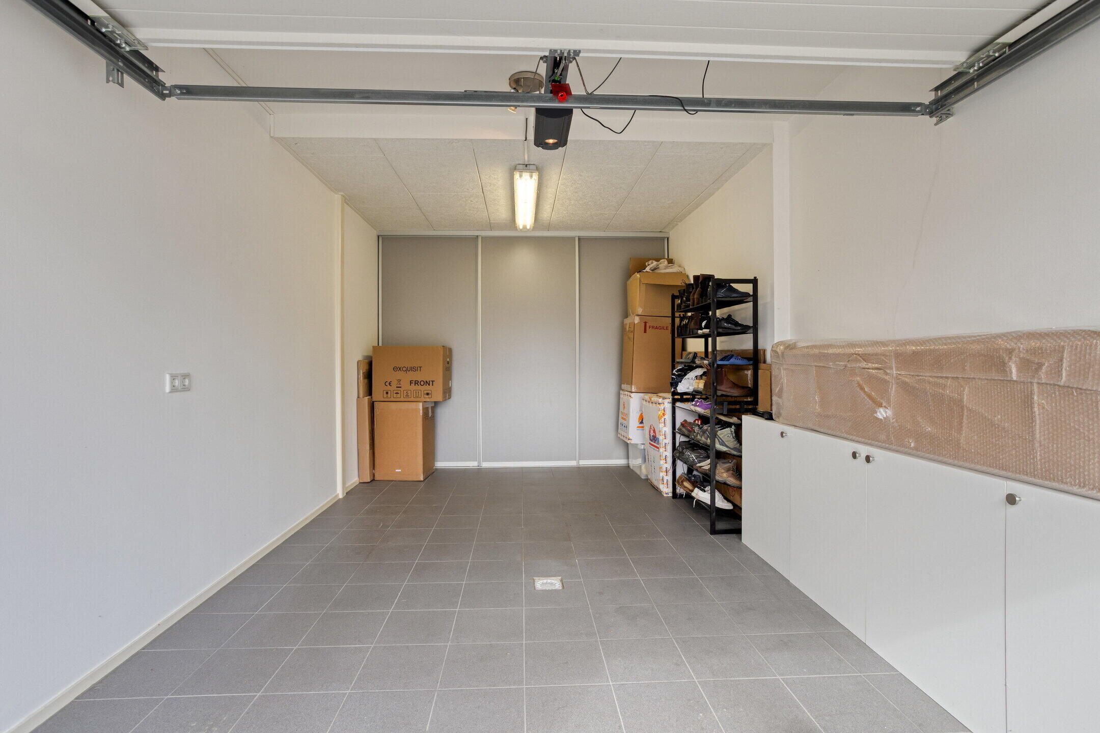 De volledig betegelde garage (ca. 22 m²) is netjes afgewerkt en voorzien van een elektrische sectionaalpoort en een kastenwand met schuifdeuren over de volle breedte.