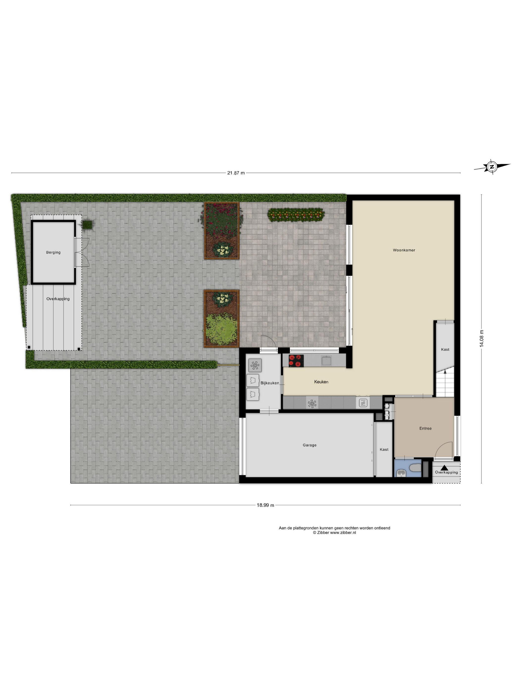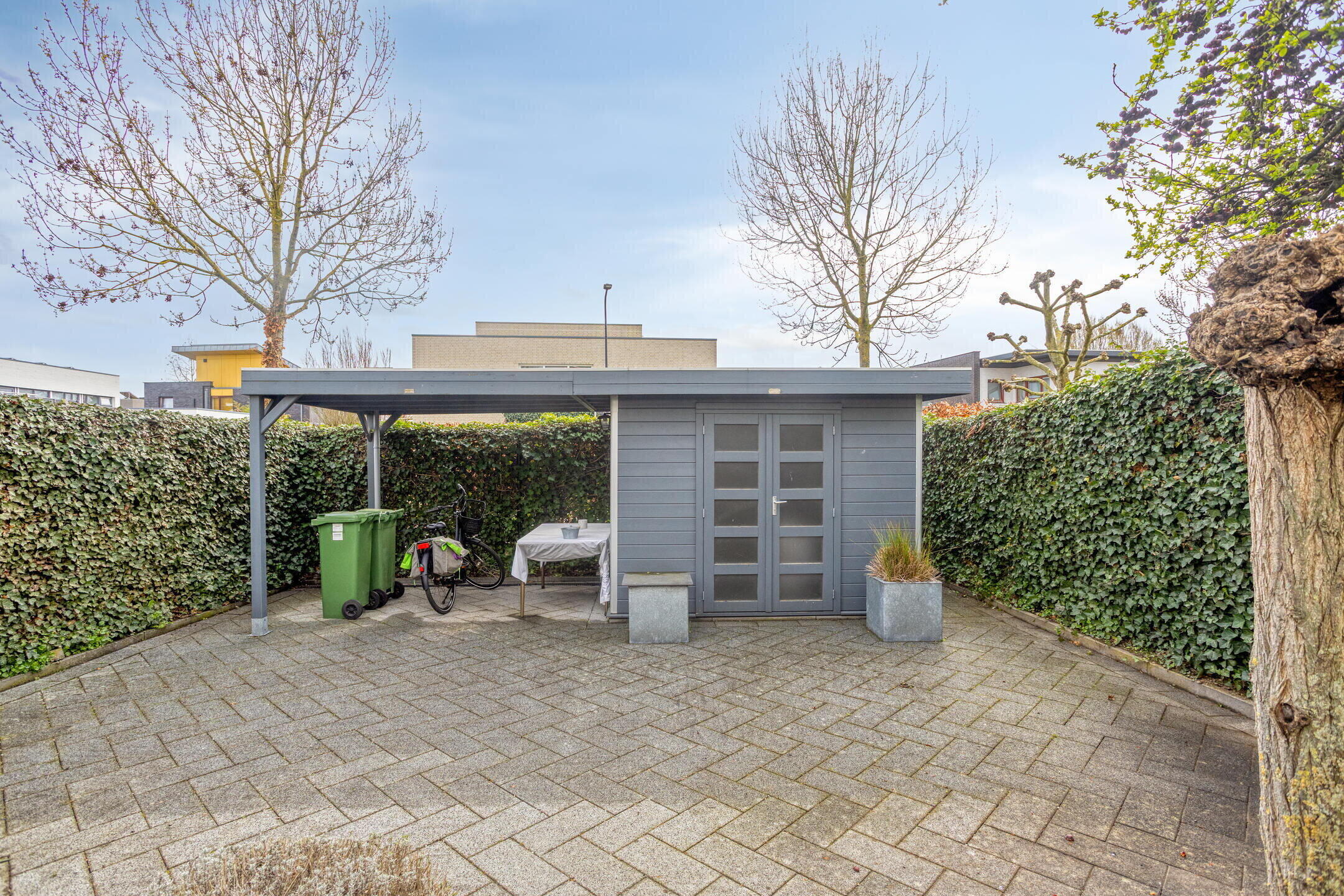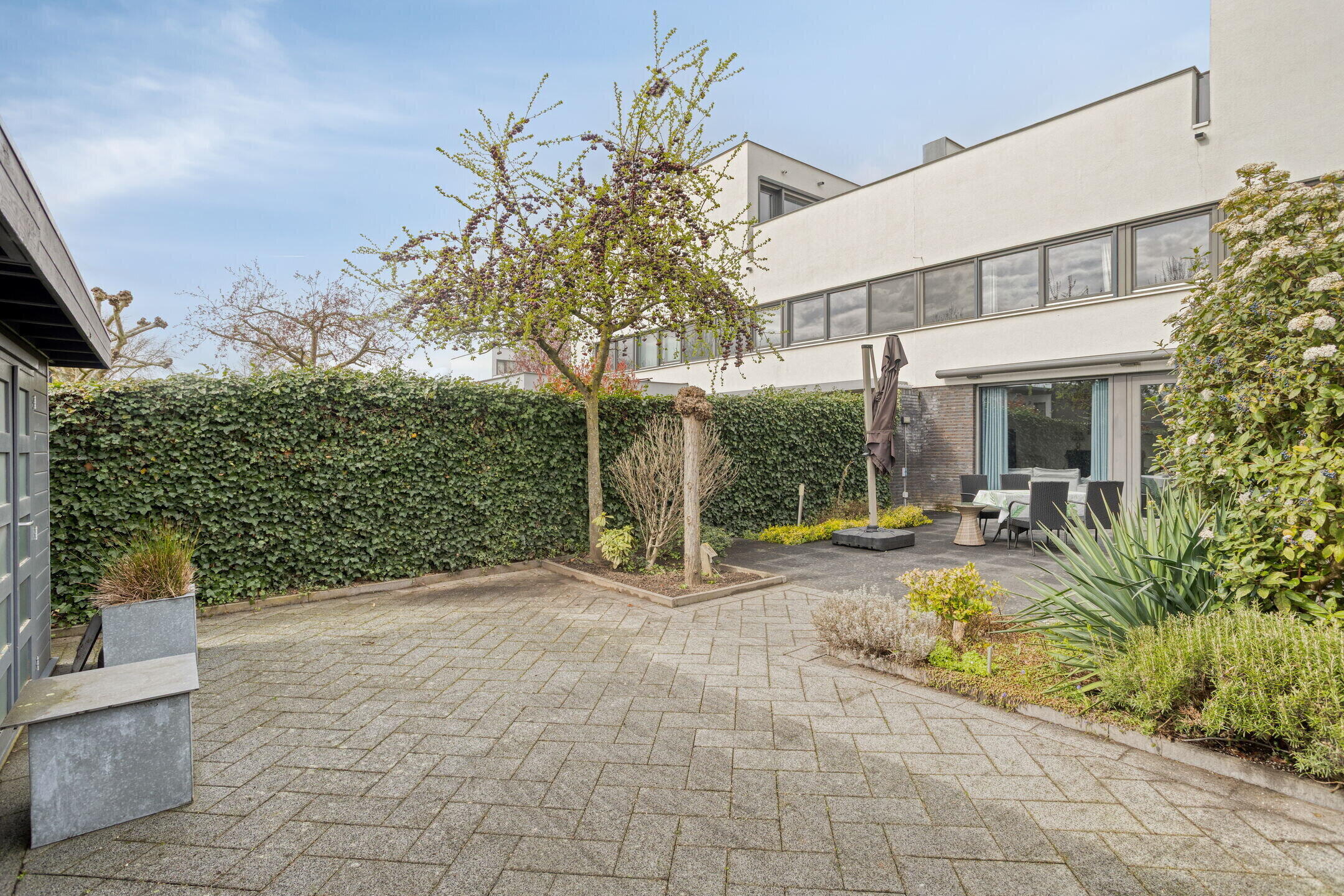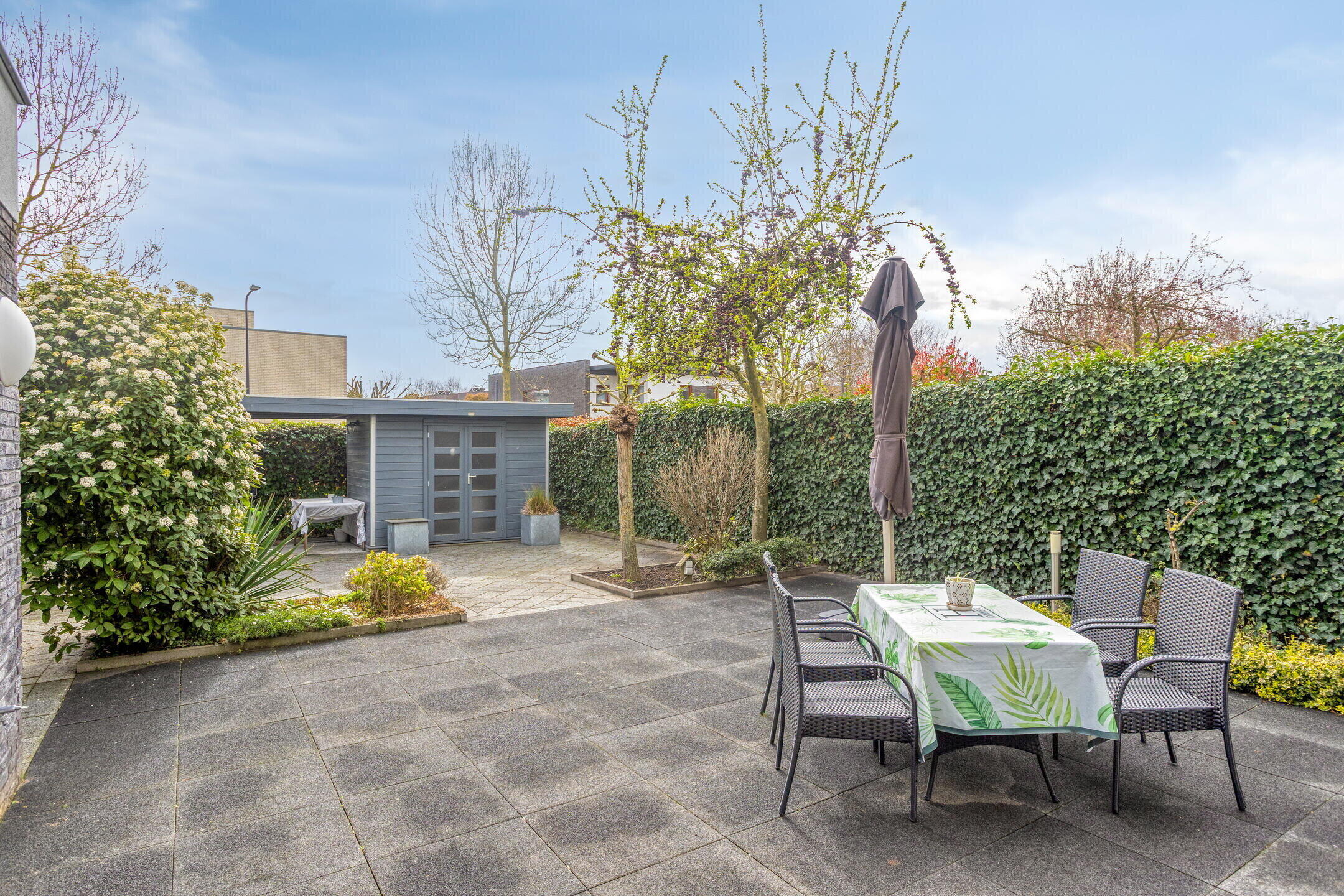 Onderhoudsvriendelijke tuin op het zuiden, deels betegeld en fraai omsloten door hekwerk met groene hagen, wat zorgt voor optimale privacy. De tuin is bereikbaar via de woonkamer, bijkeuken en een zij-ingang vanaf de oprit.